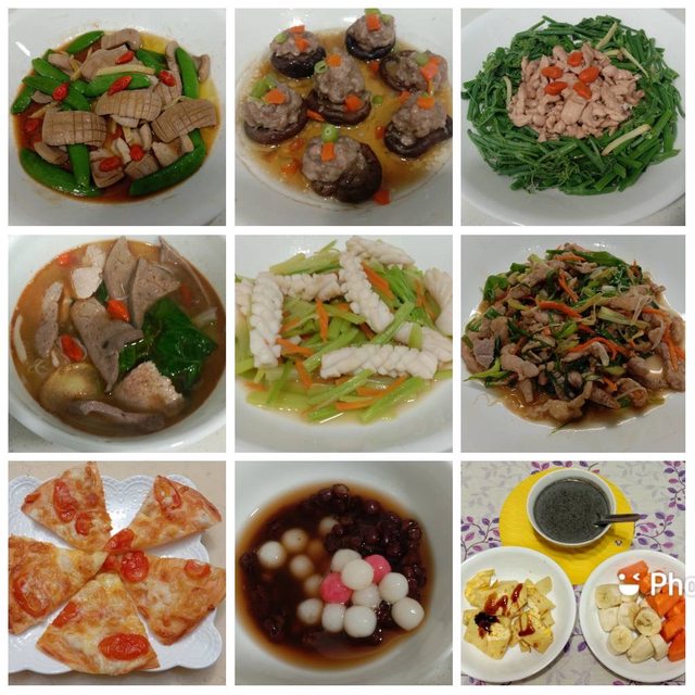 煎魚、青豆蝦仁、煎排骨、滷豬肉豆干鳥蛋、補元氣的燉湯…等等都很好吃