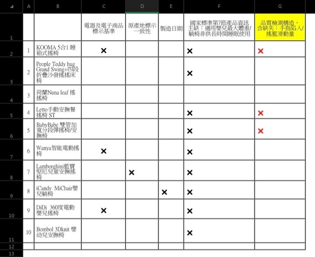 : ▲10件有9件不合格,唯獨Nuna leaf搖搖椅,是這次檢驗中唯一完全符合規定商品。(