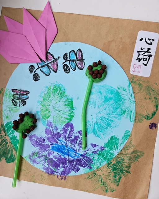 用葉子蓋印荷花,把撿來的種子插進黏土蓮蓬裡。