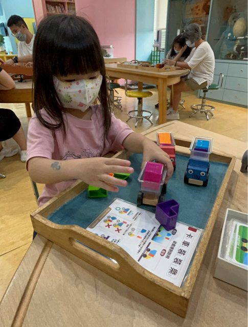 放3組道具,寶貝若想玩別桌上的教具,可以去交換或是自己去詢問可不可以使用該教具