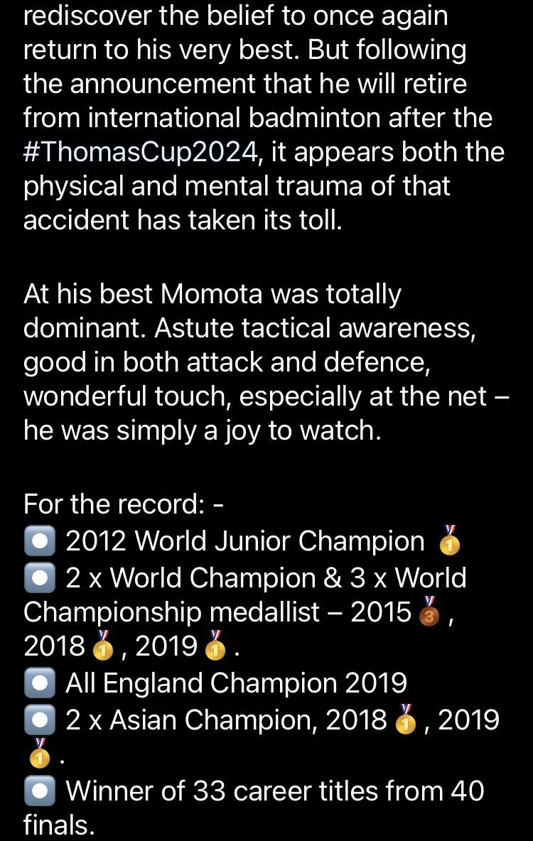 推 lyt806 : 桃田QQQQQQ真的很謝謝你這幾年帶給我的感動,雖然真 04/18 14:12