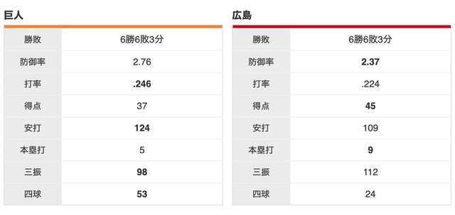 廣島 6 勝,巨人 6 勝,3 和
