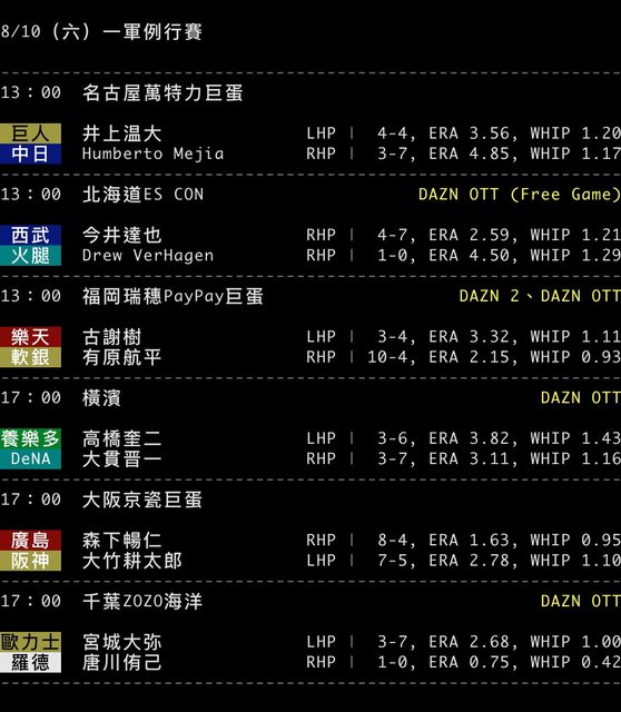 標題[情報] NPB 8/10 預告先發