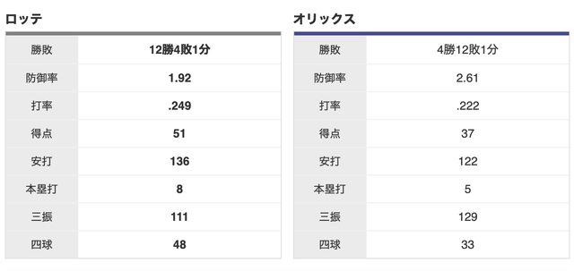 羅德 12 勝,歐力士 4 勝,1 和