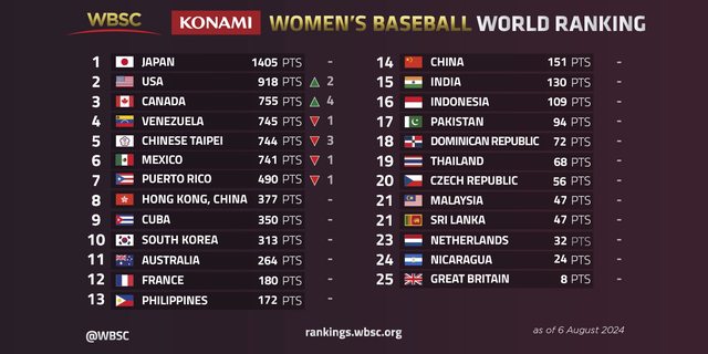 WBSC/KONAMI Women's Baseball World Ranking: Japan consolidate No. 1 position;
