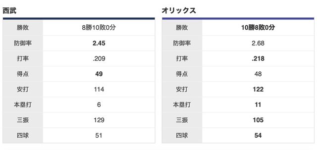 歐力士 10 勝,西武 8 勝