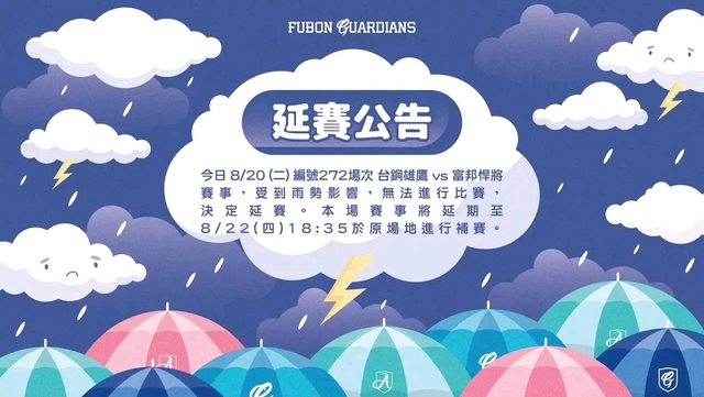 今日 8/20 (二) 編號272場次 台鋼雄鷹 vs 富邦悍將賽事,受到雨勢影響,無法進行比