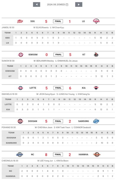 標題[數據] 韓職8/21結果(梁玹種躍升韓職三振王)