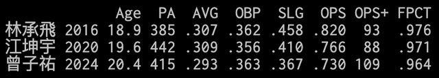 → Mazda6680: 曾子佑是第一年的新人,就跟阿飛阿坤放在一起當然厲害 08/22 17:47