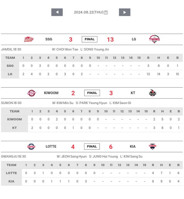 敗:金善起(Kiwoom)(4敗)—1局,1H(1HR),1R(1ER)(20球)