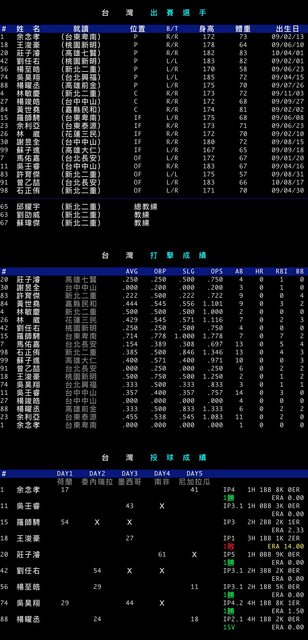 台 灣 (1W-1L) AVG OBP SLG OPS AB HR RBI BB