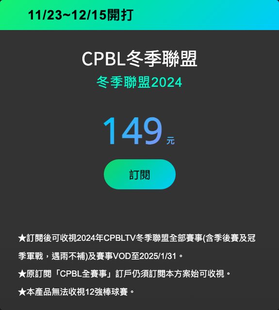 ★訂閱後可收視2024年CPBLTV冬季聯盟全部賽事(含季後賽及冠季軍戰,遇雨不補)