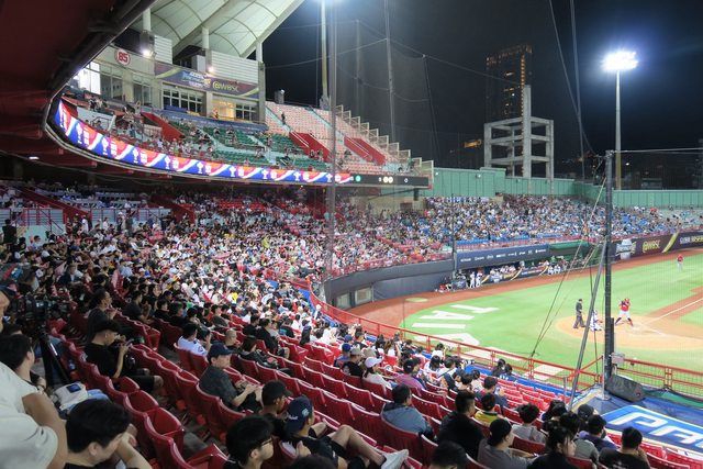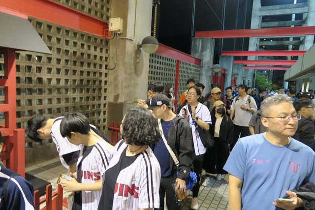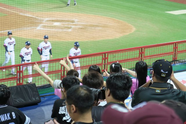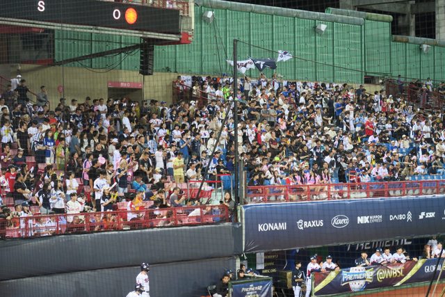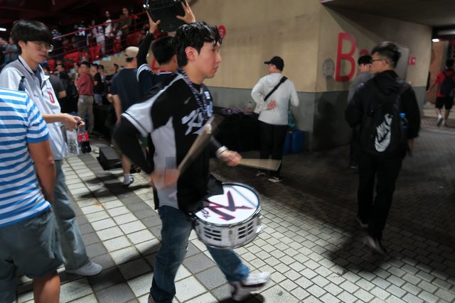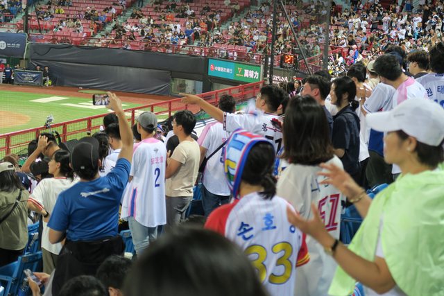 (9) 三壘側滿滿都是韓國人,他們好像從四面八方湧現,讓天母棒球場彷彿變成了韓國的主場 。人多、聲大!今晚天母棒球場變成韓國主場了