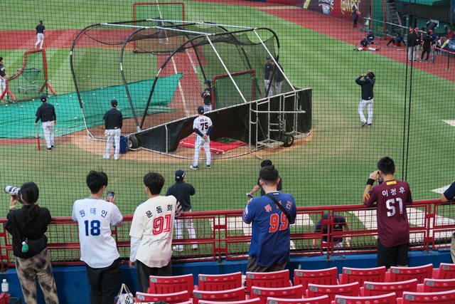 (3) 在比賽開始前,韓國球迷趴在欄杆看打擊練習的女球迷比男球迷還多!她們專注的眼神和 興奮的神情,讓人忍不住被這股熱情感染!