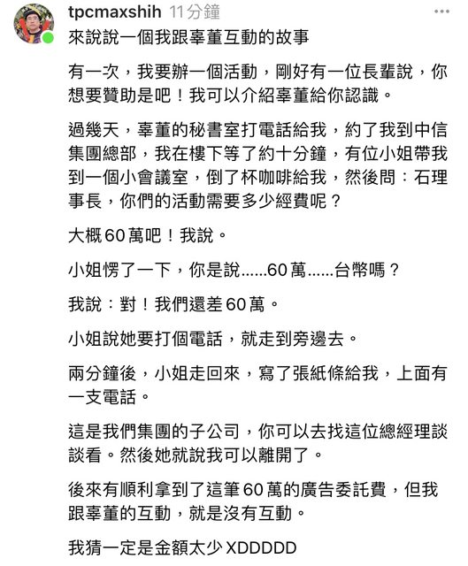 → upt: 為了60萬 要找關係找到辜董 還讓辜董秘書室安排見面 長輩跟辜 11/29 12:00