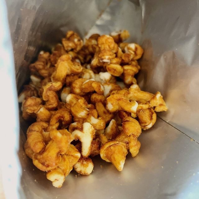 米花外表幾乎算是蠻均勻裹滿的焦糖醬,焦糖的口味很濃,帶一點點微微苦味,但吃起來