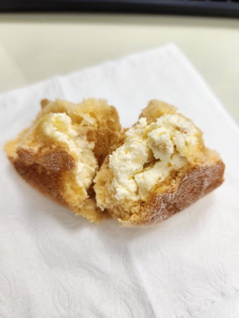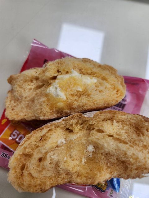 麵包體本身鬆軟,內餡不均勻,集中在某一半邊。