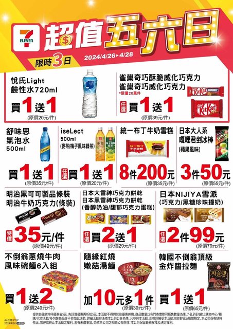 : 標題: [情報] 7-11 超值五六日 4/26~4/28