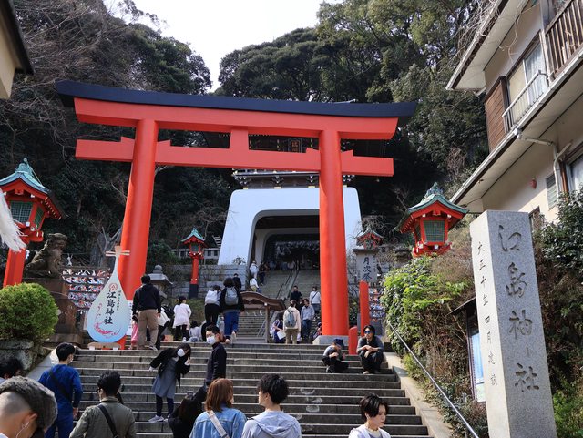 出了車站往前走一段後向右過卞天橋就到了江之島