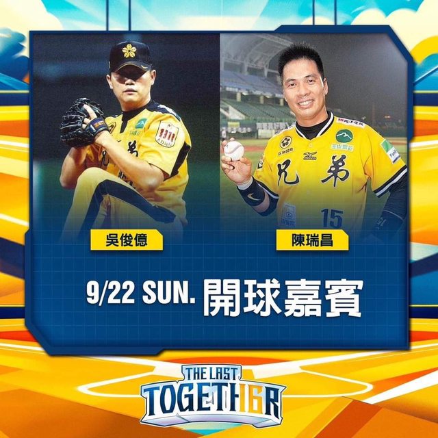 9/22(日) 的開球儀式中,吳俊億、陳瑞昌兩位前輩將再次投捕搭配,而周思齊也將站上