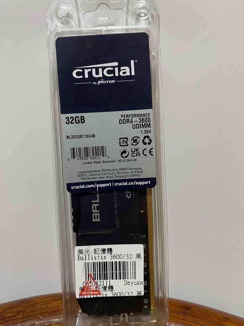 1.美光 Ballistix DDR4-3600 32G CL16 黑色 32G x1