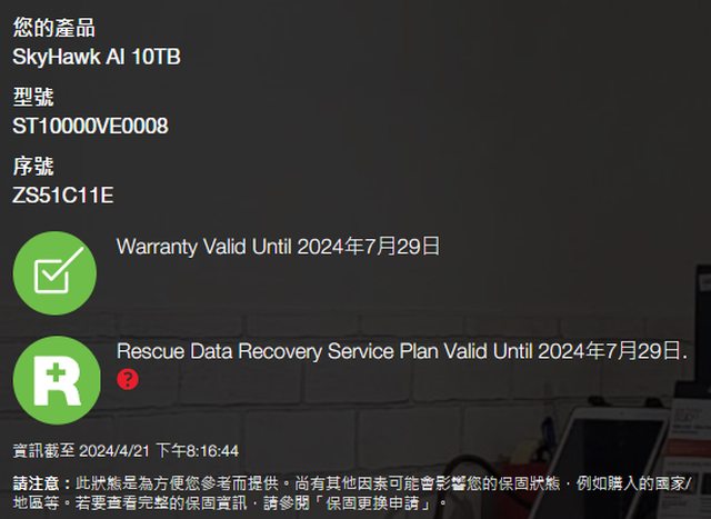 ◎硬體型號: Seagate SkyHawk AI 10TB