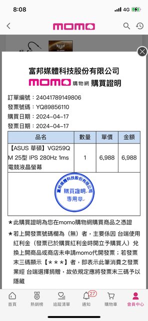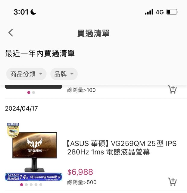 螢幕:華碩 TUF VG259QM 25型 IPS 280Hz 1ms