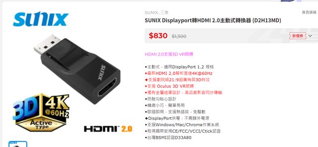 1. SUNIX三泰 Displayport轉HDMI 2.0主動式轉換器。