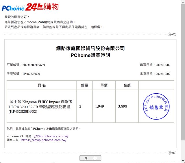 3. 2023/12/09 購於PCHome
