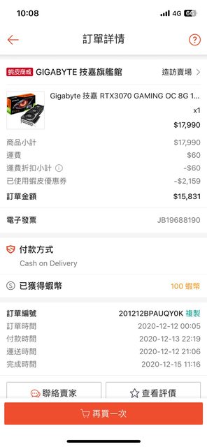 VGA顯示卡: Gigabyte RTX3070 gaming OC 8G/1815MHz/28.6cm/三風扇/五年保 (2020.12