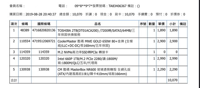 HDD: Toshiba 2tb/7200轉/SATA3/64MB/過保 (2019.08購買)