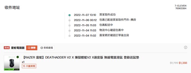 2. 2022/11/04 於蝦皮 Razer雷蛇電競館購買滑鼠時的贈品