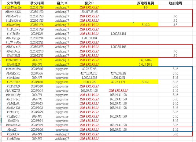 3. 根據近兩年期間的發文IP紀錄,Weizhong17 與 puppyisme 主要發文IP