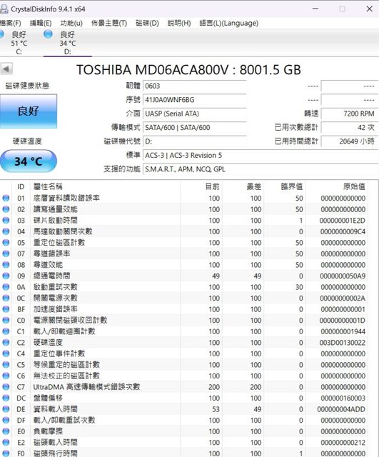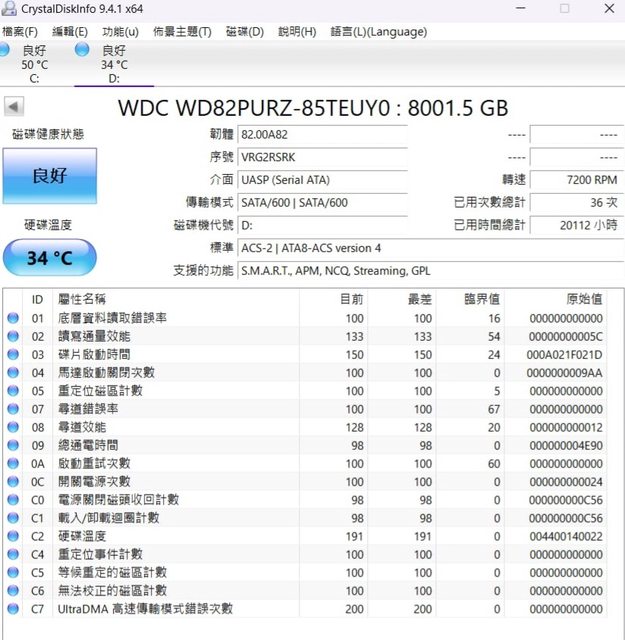 ◎硬體型號: 1.WD紫標8T WD82PURZ 2.東芝8T MDO6ACA8OOV
