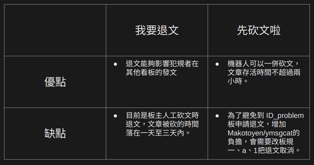 → farkforlice: 單純砍文感覺不痛不癢,退文帳號直接掛一個紀錄在 04/19 21:42