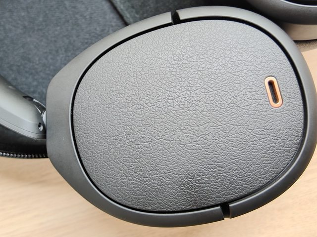 整體是霧面磨砂的塑膠,耳罩外殼有仿荔枝紋的裝飾,黑色配上金色的拾音孔質感滿不錯的