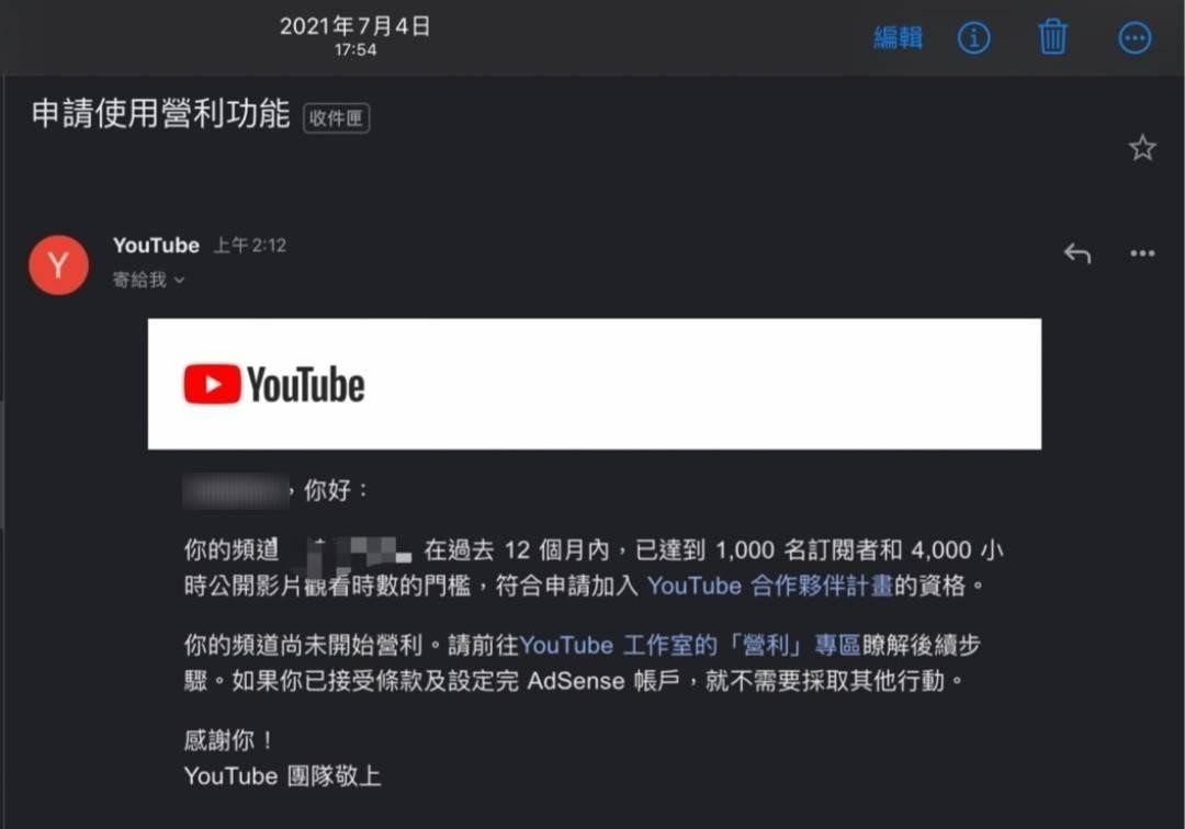 → KingNothing : 條件要先滿一千訂閱以及一年內滿4000小時觀看,達成 11/05 22:35