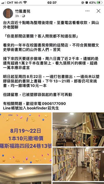 標題[情報] 台北 8/19-22 竹風書苑 二手書1本10元