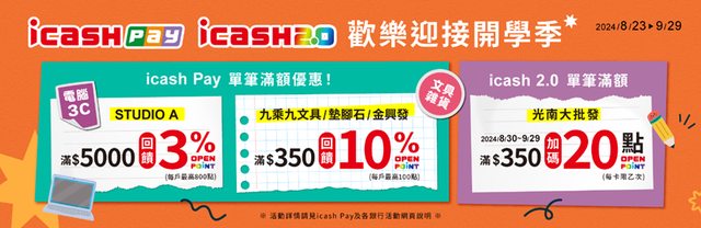 8/23-9/29 用icash Pay到墊腳石圖書、九乘九文具、金興發百貨單筆消費滿$350回饋