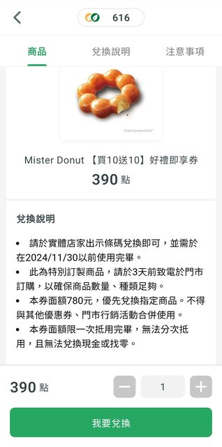 → kilo7: 兌換時一堆甜甜圈要加錢 換算一顆要40以上 49.216.25.151 10/16 20:53