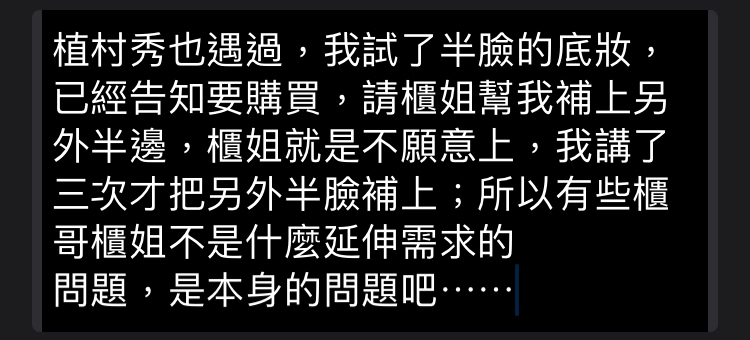 → annatzang: 不到滿意的服務那我上專櫃花錢幹嘛 114.36.240.248 10/01 03:07