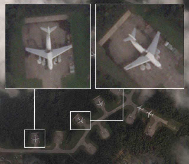 由照片可見,最少兩架IL-76確認完全燒毀,另外兩架機身中部受損 (符合俄方承認4架飛機受襲的消息)
