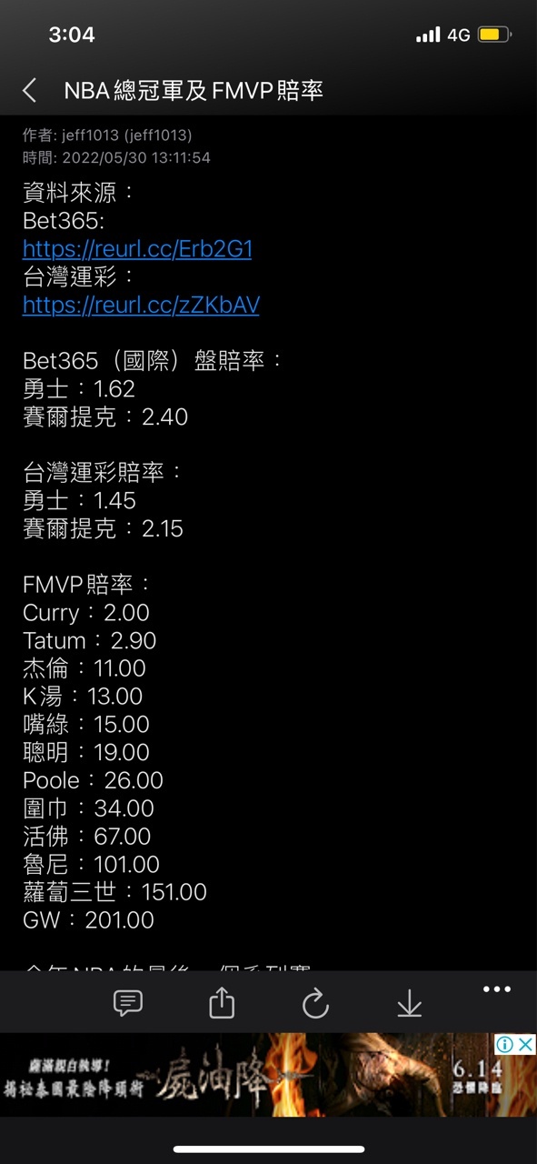 噓 b52617 : 賽前各種賭盤看好小牛? 06/09 01:31