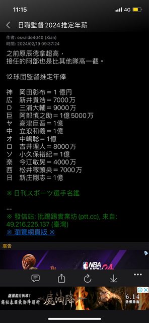 推 jeff1013 : 嗯對啊 NPB給總教練的薪水甚至有些比明星等級還高 06/08 11:12