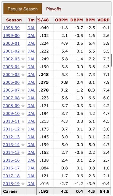 ※ 引述《nO25948 (小柴柴)》之銘言: : 拿出上個獨行俠球星Nowitzki比 : 一樣被說防守黑洞 : 可是還是靠他的進攻贏了熱火三星 : 那時的James跟Wade都是巔峰年紀 Dirk防守黑洞?!哪有啊...... 生涯巔峰期他DBPM長年正數 https://i.imgur.com/iKWQs0C.jpeg