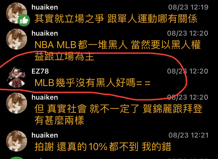 → huaiken : NBA MLB都一堆黑人 當然要以黑人權益跟立場為主 08/23 12:20
