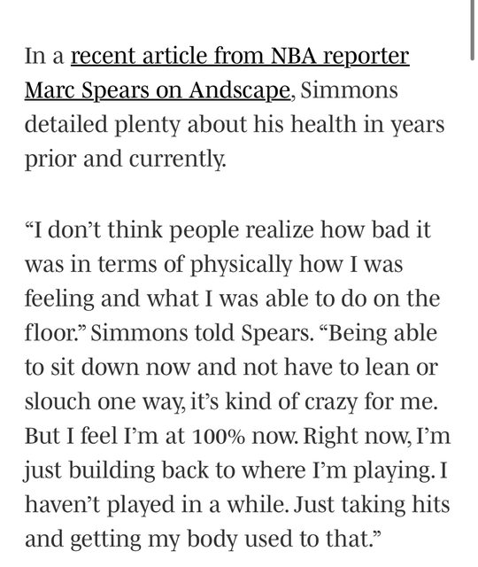 節錄重點翻譯: 在NBA 記者 Marc Spears 近期發表在 Andscape的文章中, 西門分享了他過去傷勢的細節 與現在狀況。 西門表示:「 我認為人們並不真的了解我身上的狀況以及忘記我曾經能在場上做到的事 情;現在我可以好好坐下,而不用刻意傾向某個方向,這對我來說很瘋狂。但現在我百分 之百康復了,正在一步步重返球場,我有一段時間沒練球了,現在我正在做一些投籃練習 ,讓我的身體適應。」 現在是超時空打臉自己逆? 真的是嘴巴和修圖都比球技強 下面支援西門循環圖 -- ※ 發信站: 批踢踢實業坊(ptt-site.org.tw), 來自: 36.228.132.33 (臺灣) ※ 文章網址: https://ptt-site.org.tw/NBA/M.1728096878.A.6D4
