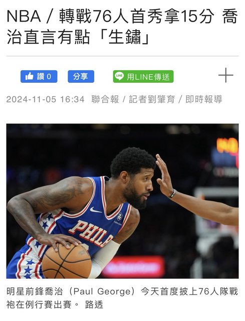 標題[新聞] 轉戰76人首秀拿15分 喬治直言有點「生鏽