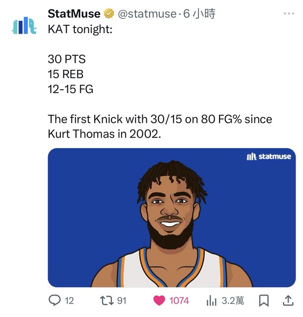 這是2002年的Kurt Thomas之後,第一位達到單場30分-15籃板-8成命中率的尼克球員