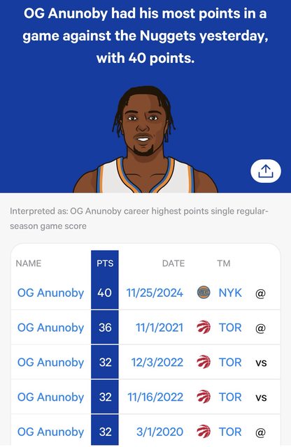 今天尼克隊前鋒OG Anunoby在客場對丹佛金塊的比賽中,